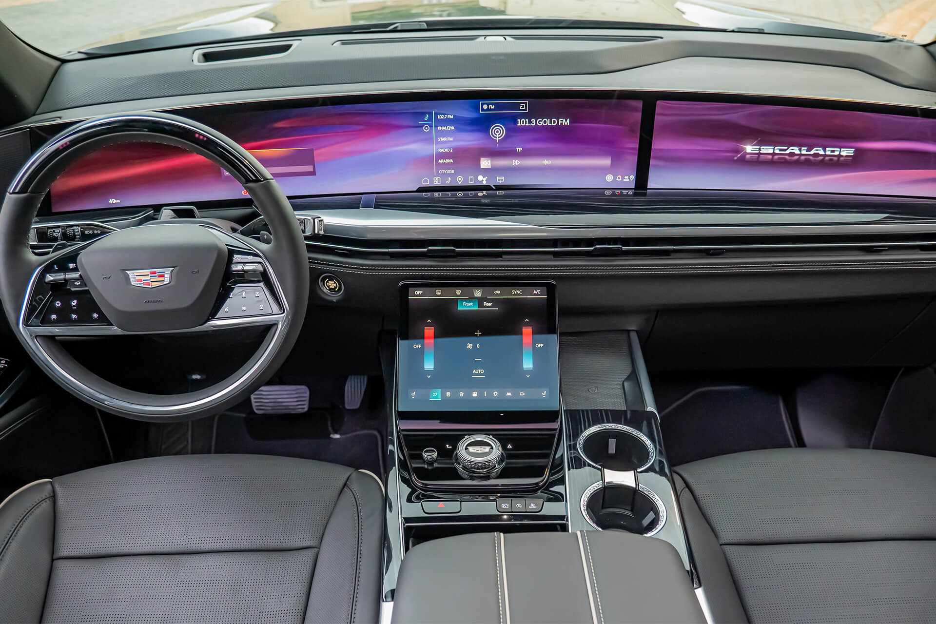 Where the Escalade further separates itself: Night Vision technology with a forward-facing thermal camera detects pedestrians and obstacles beyond 300 metres — more than twice the range of standard high-beam headlights. On late-night drives along less-lit stretches outside the city centre, or during occasional sand haze, that’s a genuine safety advantage rather than a spec-sheet footnote.