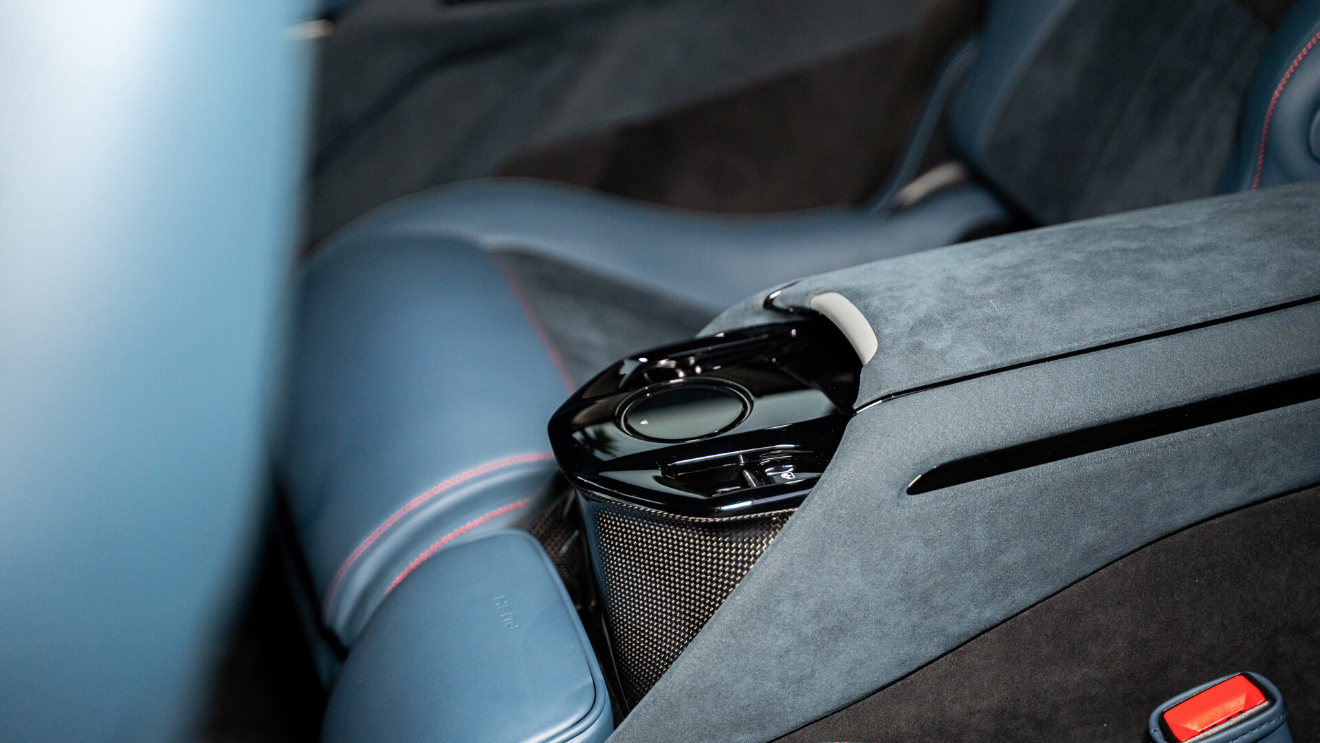 The passenger gets their own cockpit display showing performance data and entertainment options. Each rear seat passenger has individual climate controls and a dedicated tablet-style interface. The interior uses sustainably sourced materials including recycled polyester and eco-friendly fabrics.