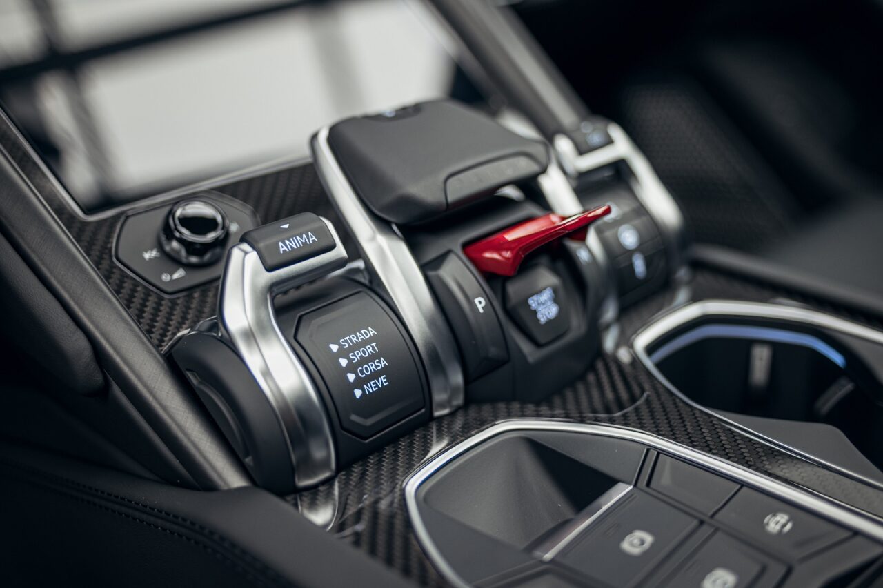 The fighter jet-style start button sits under a red cover. Alcantara and carbon fiber trim reduce weight while adding grip. The rear bucket seats feature the same bolstering as the fronts, with heating and ventilation for Dubai’s climate.