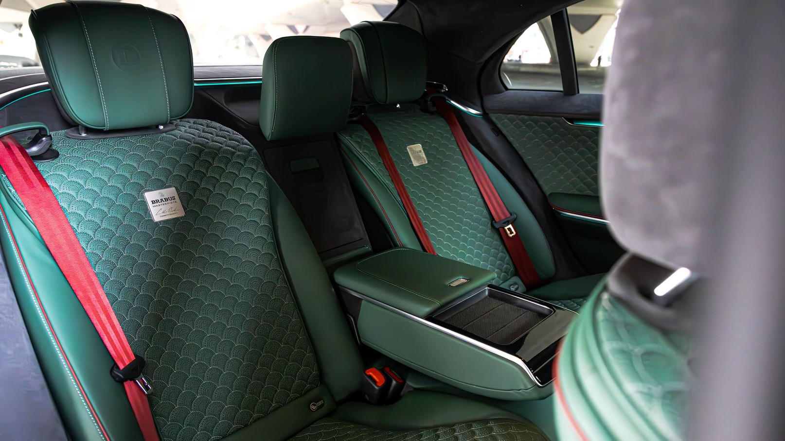 Step inside and experience handcrafted refinement: emerald-green leather seats, contrast stitching, Brabus badging, and ambient lighting create a cabin that feels both futuristic and regal. Rear executive seating, massage functions, and panoramic sunroof ensure every ride is first-class — whether you’re behind the wheel or being driven.